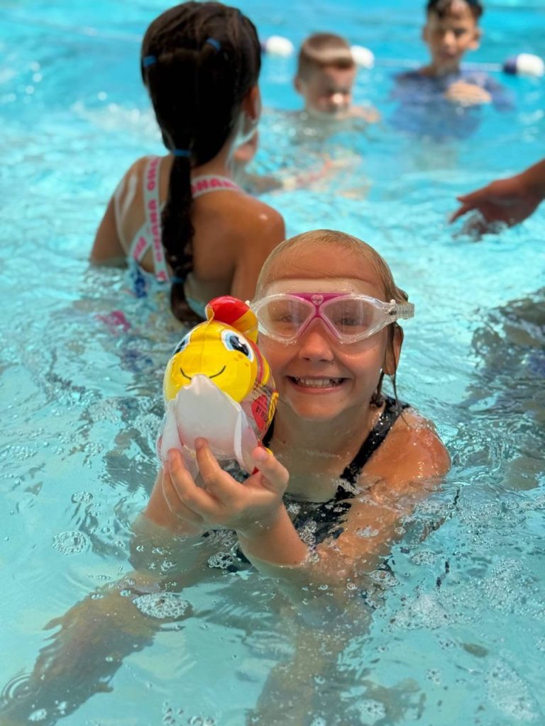 Бассейн: купание, игры, душ, аквааэробика. Дети, которые не идут в бассейн, играют в водные игры на суше