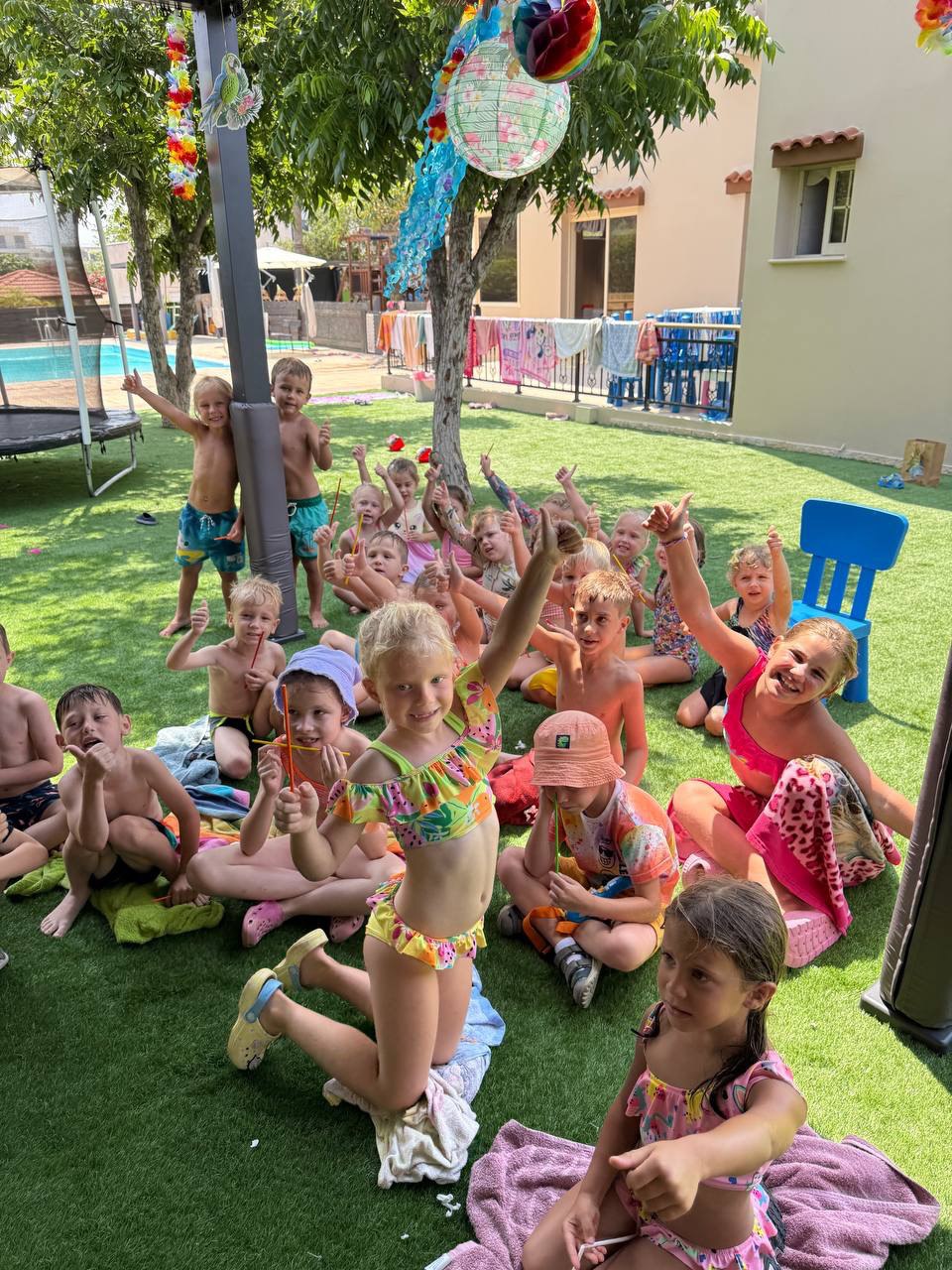 Бассейн: аквапарк, купание, душ. Дети, которые не идут в бассейн, играют в водные игры на суше